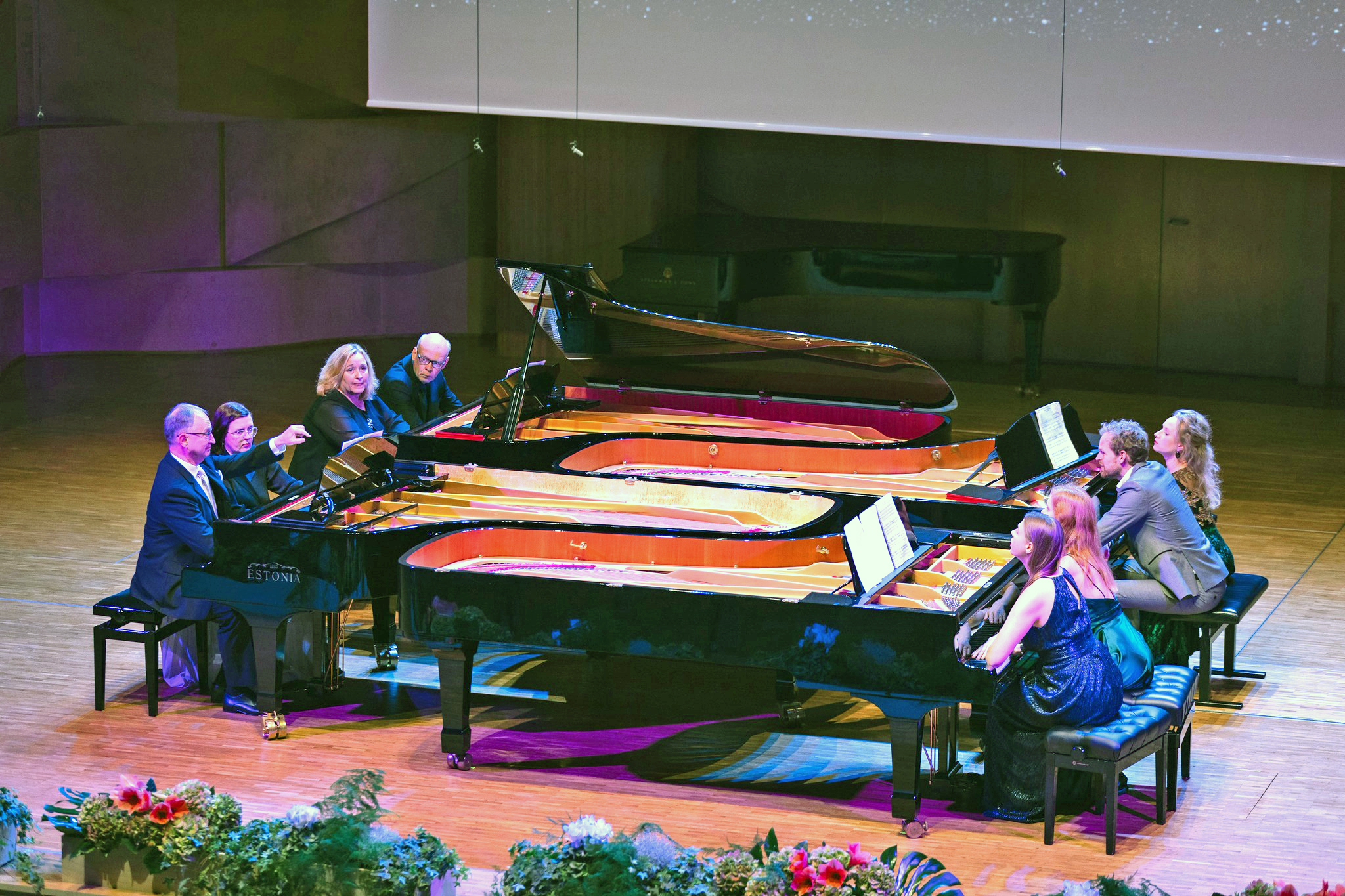 Urmas Sisaskile oli muusika maailma tajumise viis ja musitseerimine elamise ja olemise loomulik olek. Klaveri taga nautis ta selle instrumendi rikkalikke kõlavõimalusi, lasi pillil kogu tema ilus heliseda. Armastus nii galaktikate kui klaveri vastu on leidnud väljenduse “Universumi häältes” – sümfoonias neljale klaverile, 8 pianistile, 16 käele. Märgiline on teose oopuse number 88: klaveril on sama arv klahve ning tähistaevas sama palju tähtkujusid. Teos sai esiettekande 2002. aastal festivalil “Klaver”. Nüüd oli taas haruldane võimalus seda kuulata – EMTA suure saali laval oli neli klaverit ja esinduslik pianistide plejaad. Helilooja noodinopped Universumi ajaskaalalt, käsitledes selles suurteoses Kõiksust kui tervikut, pani võimsalt lummavas esituses Sisaski autoriõhtule suurejoonelise punkti.